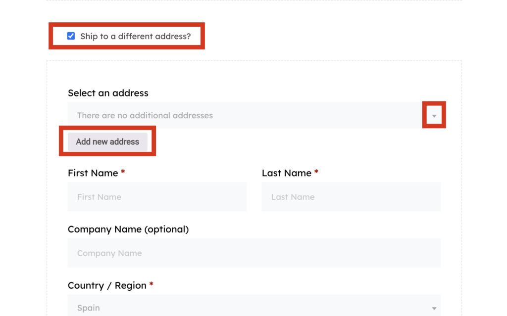 Para añadir una nueva dirección de envío, solo tienes que ir al checkout y marcar la opción “Enviar a una dirección diferente”.