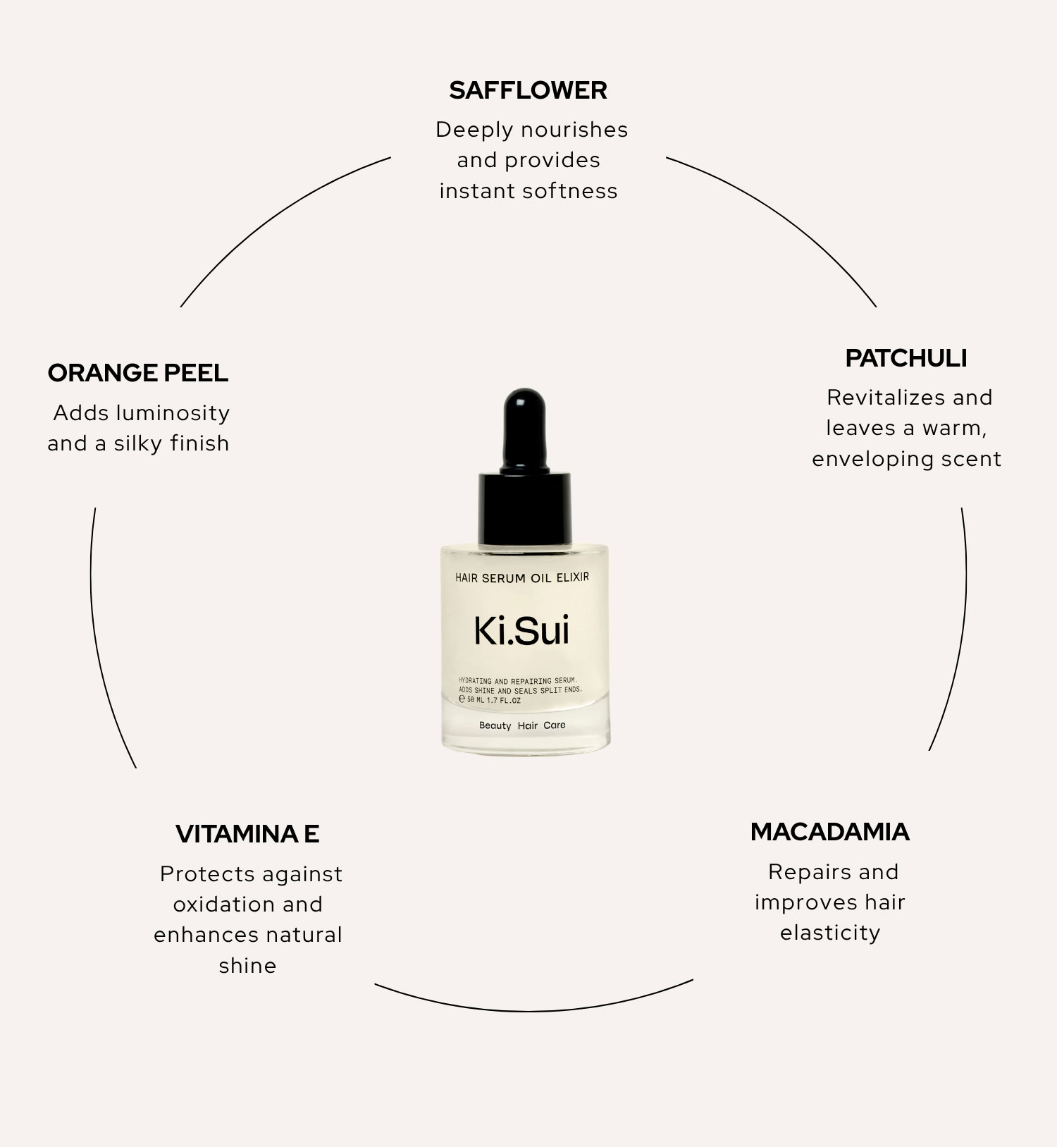 Safflower Oil, Macadamia Oil, Vitamin E, Patchouli Oil, Orange Peel Oil.
